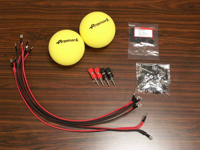 スピーカーユニットからの配線ケーブルは3組出ているが、ウーハーの2組はターミナル側の圧着端子で並列接続にまとめている。また、2個のスポンジボールはバスレフダクトに干渉しないように上方に入れている。