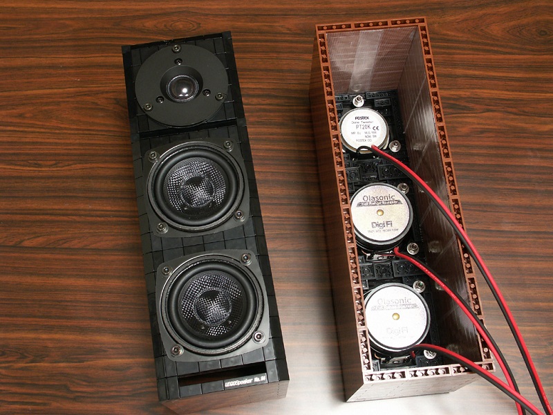 意匠的にはフレームをブラウンのLEGOブロックで造り、ウッドボディのような効果を狙う。黒いグラスファイバーコーンの精悍なスピーカーユニットとのマッチングでスタイリッシュなモデルにまとめたい。