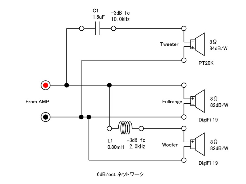 8cmフルレンジユニット2本とトゥイーター1本を搭載した2ウェイなので、1本のフルレンジユニットをアンプ直結で使って、これに低音域を入力したフルレンジユニットと高音域のトゥイーターをプラスすることを考えてみた。(図2)