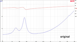 図5がオリジナルのインピーダンス特性である。明確な2山特性できちんとバスレフが動作していることがわかる。谷の周波数は100Hzなのでバスレフ共振周波数が100Hzであるとわかる。エンクロージャキットP802-Eの仕様では90Hzであるが、共振周波数はスピーカーユニットの影響も受けるので上昇したのだろう。2山の大きさが高い周波数に偏っていることからスピーカーユニットのfoが130Hz程度にあることが予想される。