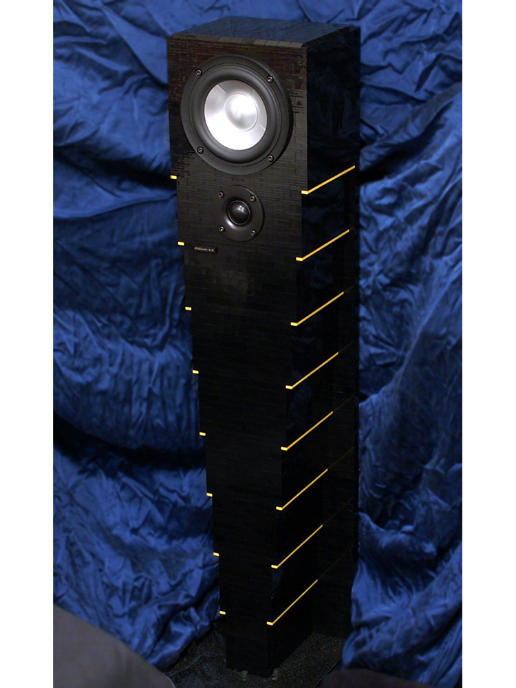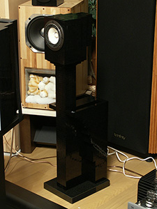 といった対策を講じている。トップヘビーのトールデザインなので、できるだけボトムに重量バランスを移し、エンクロージャが途中で折れてしまわないようにベルトでベースに強いテンションで縛っている。そして、ベースごとひっくり返ってしまわないように、ベース部分にさらにトータル5kgのオモシを付加したのである。