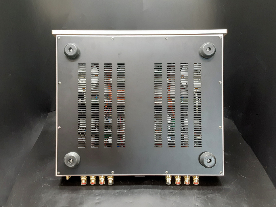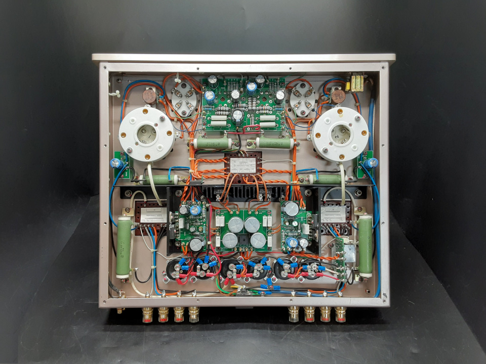 本製品発売当時、300Bで845をドライブする回路は一般的ではありませんでしたが、その鮮度高い音質は当社製品の歴史の中でも決して欠かすことのできないものです。1kV近いB電圧, シングルとしては異例ともいえる28W / ch(実測)の大出力。オール三極管構成の高音質は真空管アンプが目指す究極の姿の一つです。