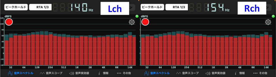 ・1kHz 正弦波1W入力にて左右能率(dB/m)が一致していること
