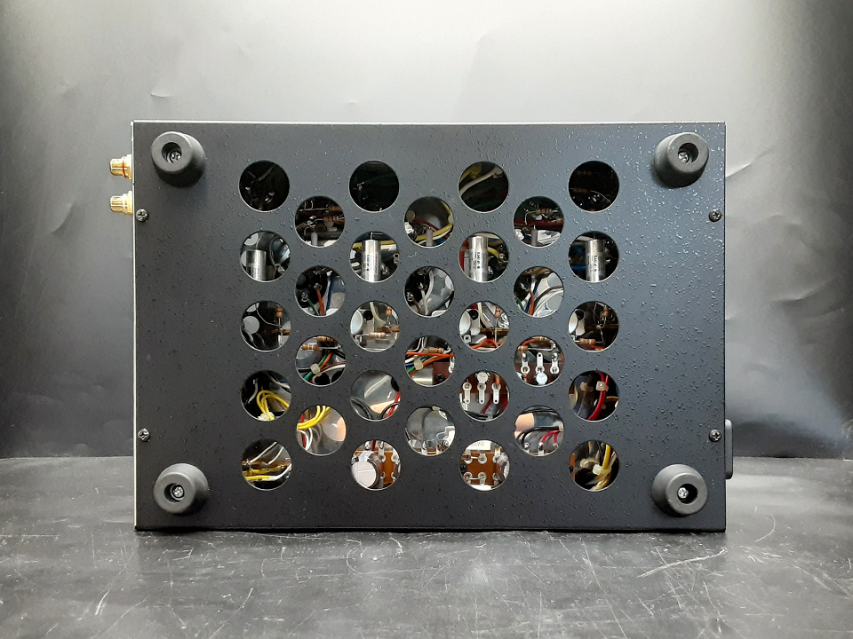 経年なりの小傷等が散見されますが、前ユーザーさまの高い技術力により、美しくワイヤリングされ外観にも大きな瑕疵はありません。手頃なサイズ, 十分な出力で楽しんで頂けるミドルクラスの多極管プッシュプルアンプです。