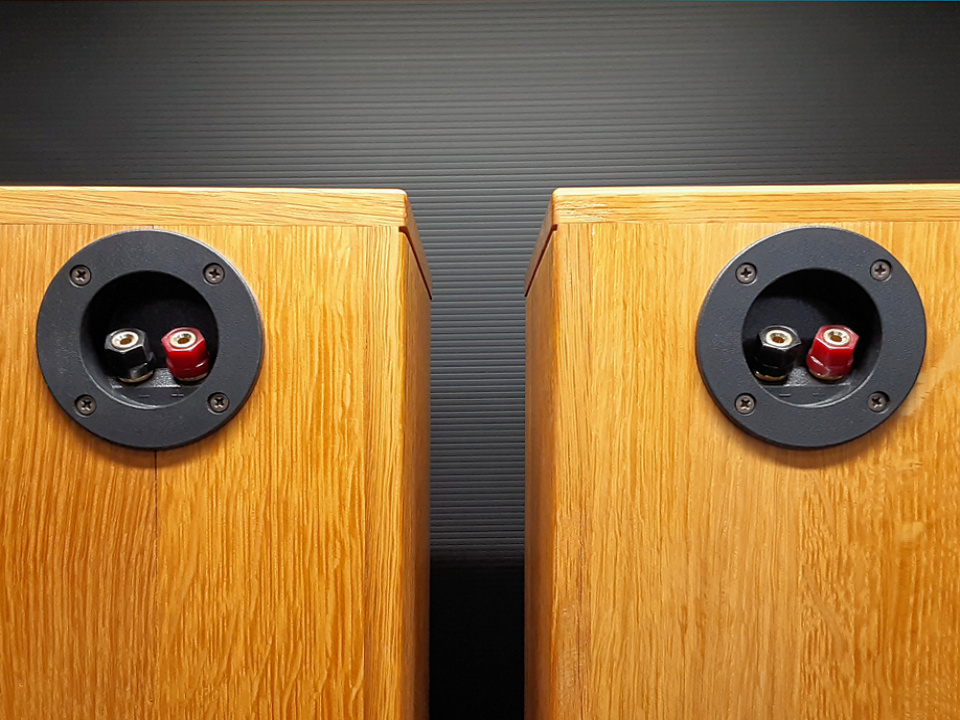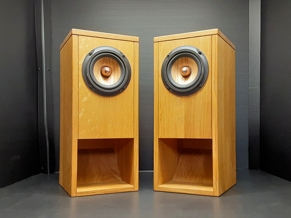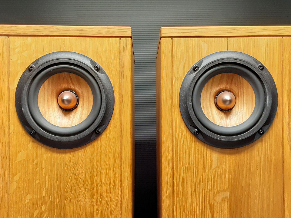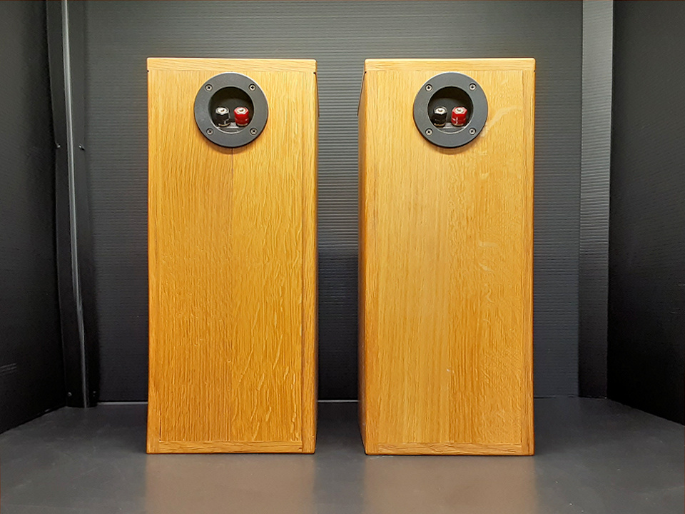 ユニット能率は6Ω / 86.5dBと高効率ではありませんが、バックロード形式ゆえの豊かな低音から、むしろ小音量で包み込まれるような音場を楽しむ使い方が最もマッチしているスピーカーです。出来ればユニットを耳の高さ(以上)に設置いただき、軽やかさも併せて引き出して下さい。